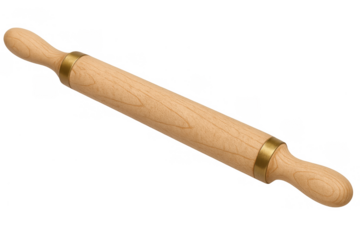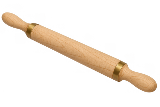A pristine, brand new classic maple wood rolling pin with ergonomic handles, isolated horizontally on a transparent background with copy space, Concept of baking essentials and quality kitchenware