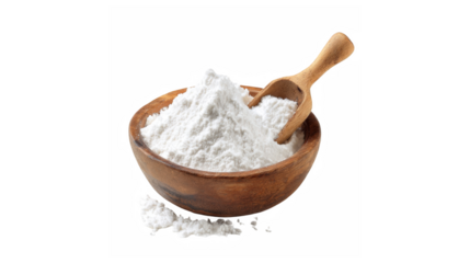 Fresh white baking powder or flour in a rustic wooden bowl with a small scoop for culinary use