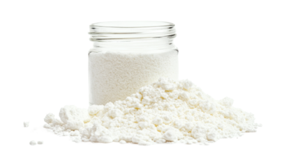 White powder in a glass jar with a pile nearby, ideal for culinary and baking applications in a clean kitchen setting, cut out