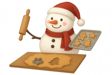Snowman baking christmas cookies, holding rolling pin and fresh baked gingerbread on tray, holiday cooking concept