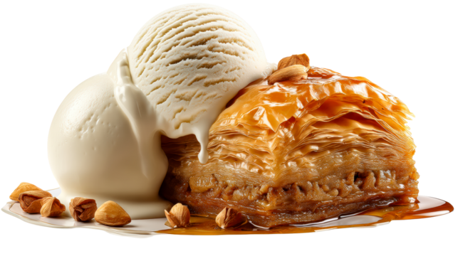 Sweet baklava pastry with vanilla ice cream and almonds, cut out transparent
