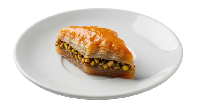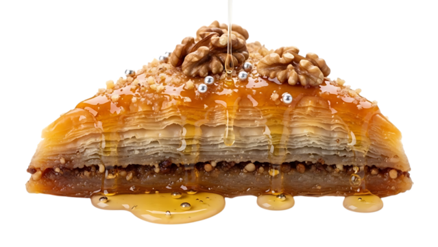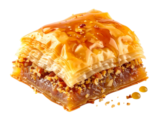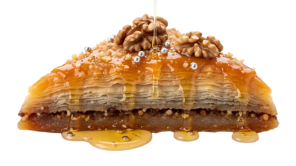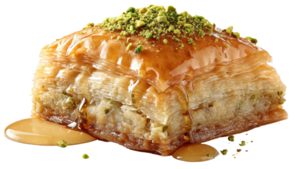Delicious baklava topped with crushed pistachios and honey. transparent background