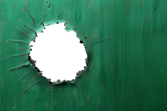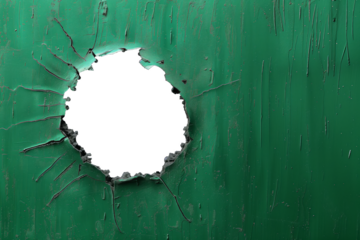 Furo trnsparente numa chapa de metal pintada de verde, png