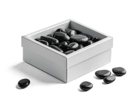 Mockup de caixa retangular texturizada branca com pedras pretas dentro e fora da caixa. Fundo transparente com sobra preservada realista, aplicação sobre qualquer outro fundo.