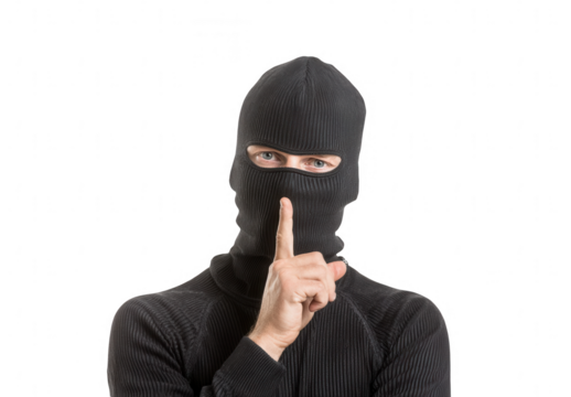 A serious thief in a black balaclava with a shushing finger on their lips, png, transparent