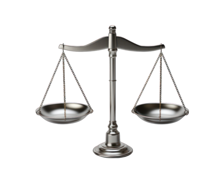 Intricate brass balance scale, polished, with two empty pans, one lower, on a transparent studio background with ample negative space. Concept of justice and imbalance