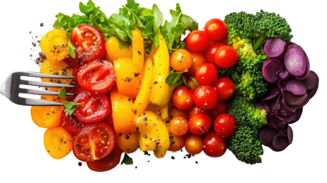 Vibrant culinary composition, an eye-level capture of a colorful array of fresh vegetables and greens artfully arranged. Isolated On Transparent and White Background