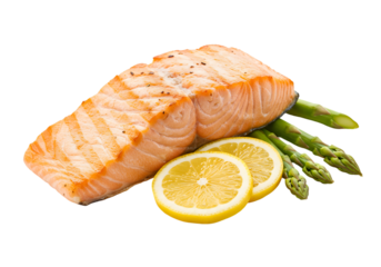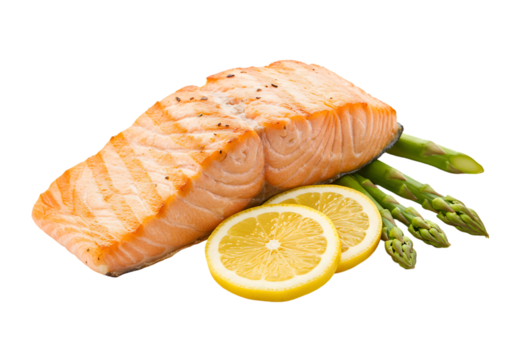 Isolated Grilled Salmon With Lemon And Asparagus On Transparent Background