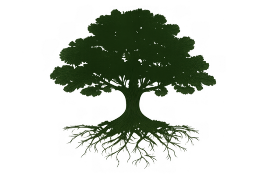 Green tree silhouette with intricate roots and full crown, depicting environmental balance, sustainability, and life cycle concepts