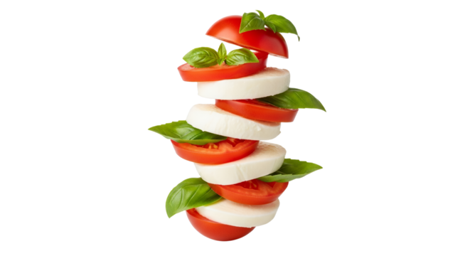 Artistic Arrangement of Tomato and Mozzarella Slices with Fresh Basil Leaves on Pure White Backdrop Delightful food still life featuring a creative