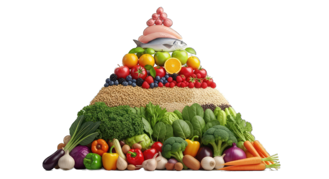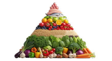 Variety of healthy foods including salmon, fruits, and vegetables isolated on transparent background, symbolizing balanced diet.