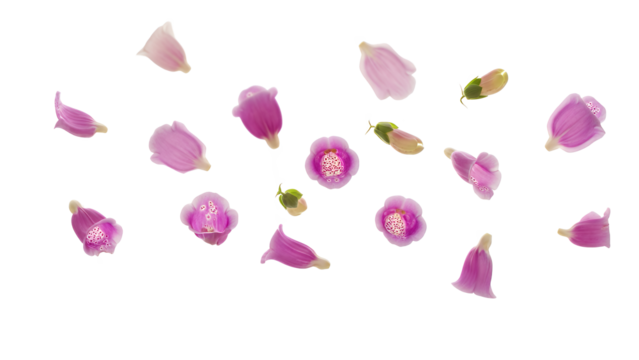 Scattered flower petals on a white background viewed from above