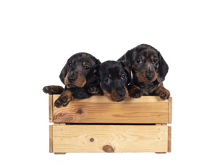 Three super cute black tiger and balck and tan Dachshund aka teckel dog puppies, hanging over edge of wooden crate. All looking towards camera. Isolated cutout on transparent background.