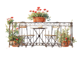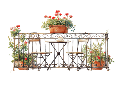 Romantic watercolor illustration of a wrought iron balcony with a bistro set potted red geraniums and a single coffee cup.