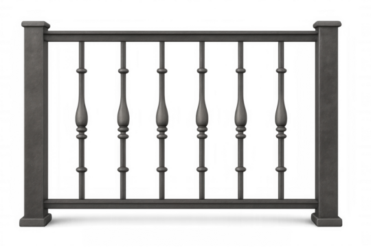View of a gray metal railing with vertical bars isolated on transparent background