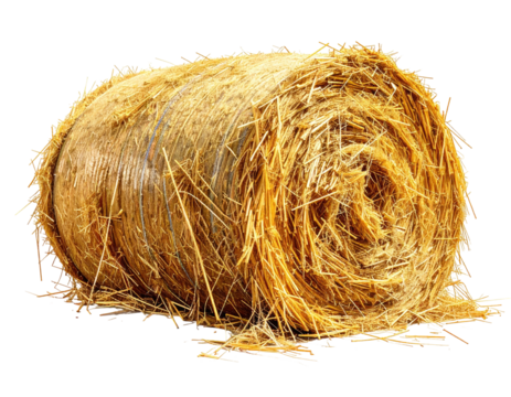 Round bale of hay, golden brown, fibrous texture, isolated