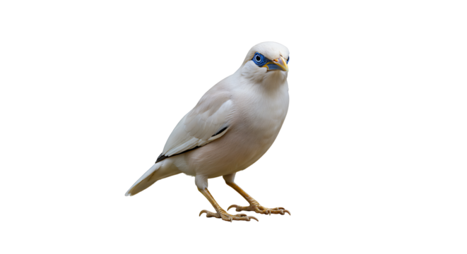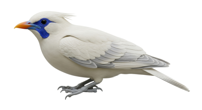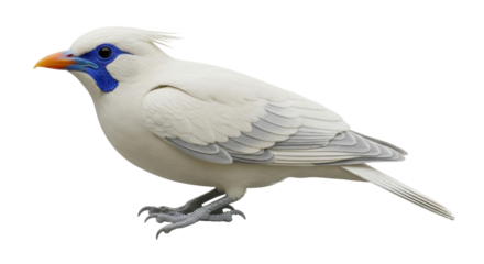 Elegant white Bali Myna bird with striking blue markings, isolated on white