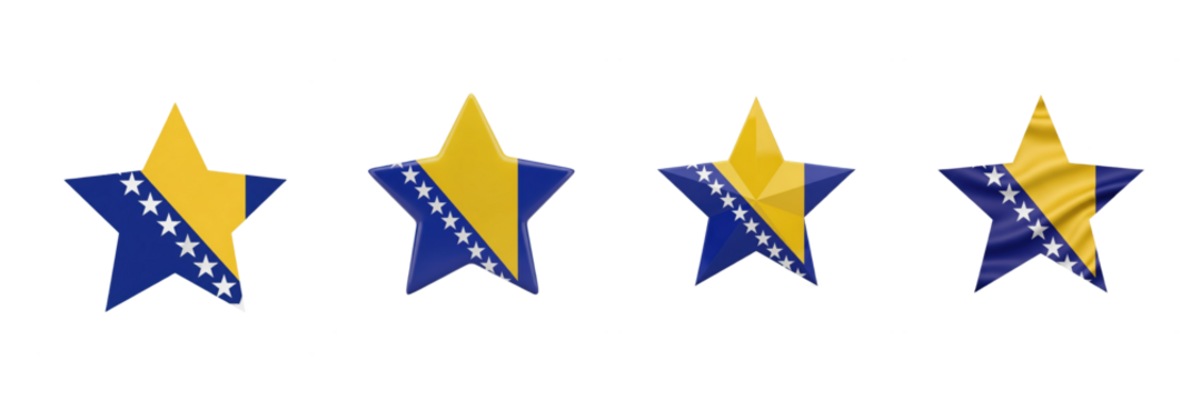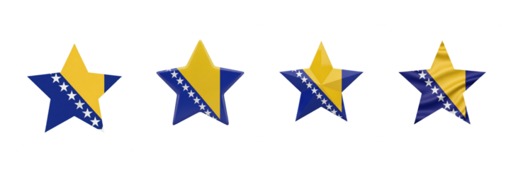 Set of four Bosnia and Herzegovina flag stars, patriotic national symbols, Bosnia and Herzegovina star shape decorations, isolated on white background, 3D render, holiday PNG.