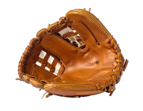 Baseball glove made of brown leather, sports equipment for catching a ball during a game, transparent background