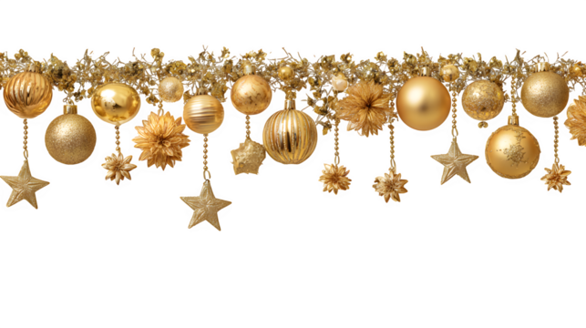 A seamless top border of assorted golden Christmas ornaments, including balls, bells, and stars. Decorative graphic element, clean and festive, isolated on white background.