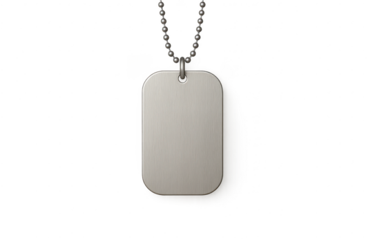 Blank silver military dog tag with chain, isolated on transparent background