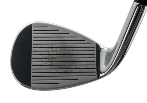 Close up view of golf wedge club head with grooves for enhanced spin and control on the green