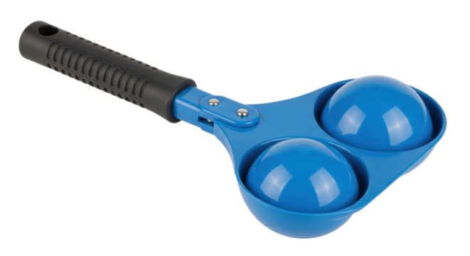 Blue plastic ball shaper for perfectly round ice cream scoops with black handle