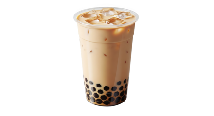 Tall plastic cup filled with iced tea and tapioca pearls