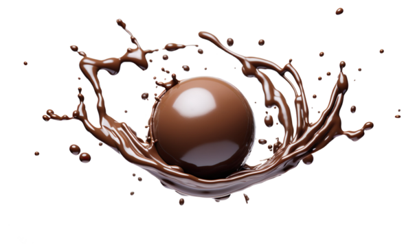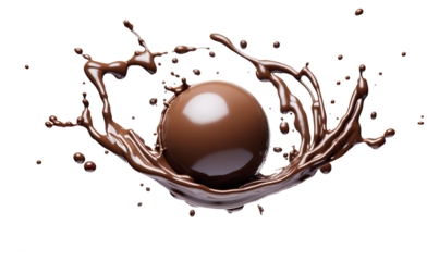 Chocolate ball falling with sauce splashing in the air dessert sweet concept, piece of dark chocolate on a transparent background