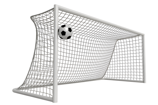 Soccer ball in goal net isolated on transparent background