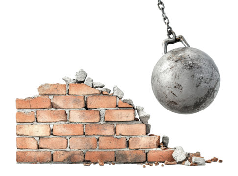 Wrecking ball smashing into a brick wall, isolated on transparent cutout background