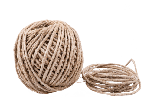 Top view of a natural jute twine string ball and roll isolated on a transparent background, PNG. High resolution.