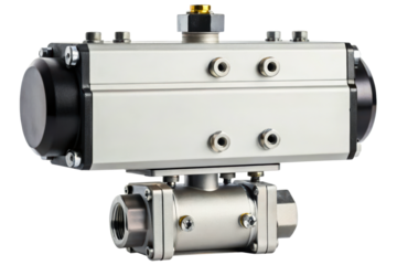 Stainless steel industrial ball valve with flange connection on a transparent background
