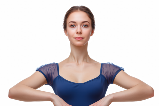 Graceful young Asian ballet partners in coordinated pose with extended arms together