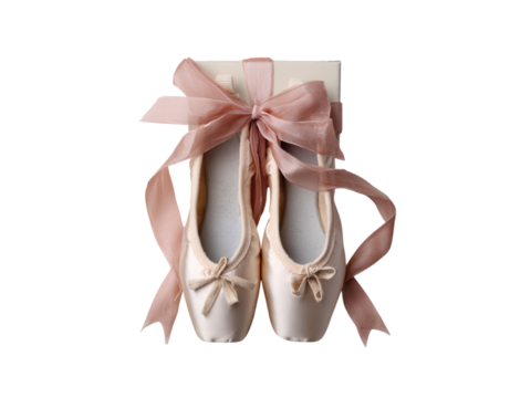 Ballet pointe shoes with satin ribbon tied together, isolated on transparent background, ready for dancing