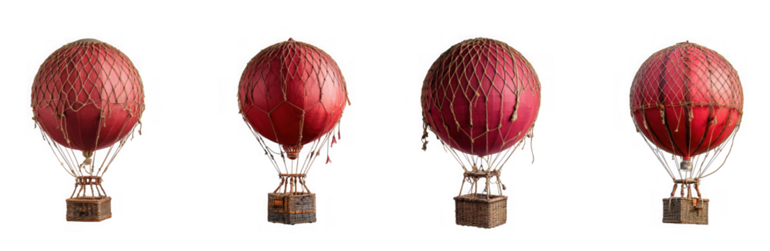 Four detailed red hot air balloons with wicker baskets are presented in a row on transparent background
