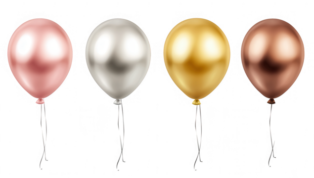 four shiny balloons in pastel colors pink silver gold and bronze each with a ribbon attached suggesting a festive atmosphere suitable for celebrations and events