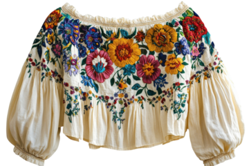 Exquisite cream blouse with vibrant floral embroidery off shoulder detail balloon sleeves and