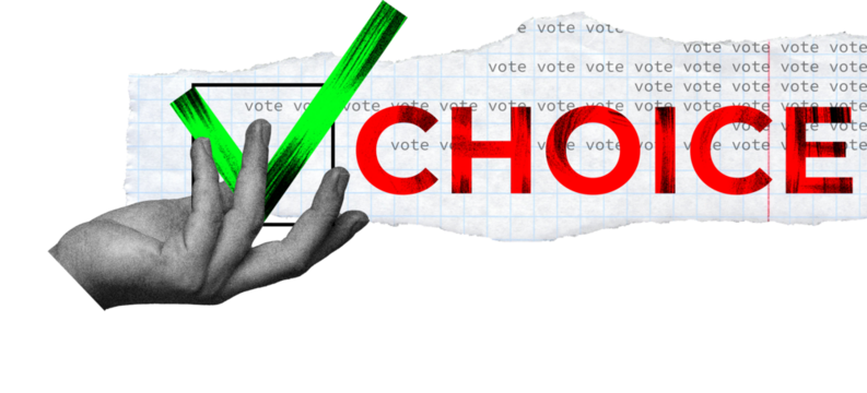Graphic artwork with bold choice lettering on transparent background. Concept of electoral selection, political alternatives, voter responsibility and democratic freedom.