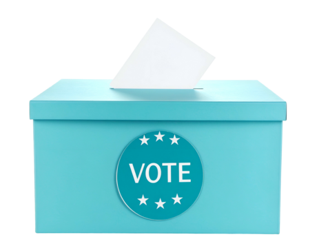 A turquoise ballot box with a paper being inserted, featuring a "VOTE" emblem