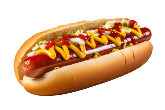 Hot Dog With Mustard and Ketchup on a Bun. A hot dog topped with mustard and ketchup nestled in a soft bun. On PNG Transparent Clear Background.