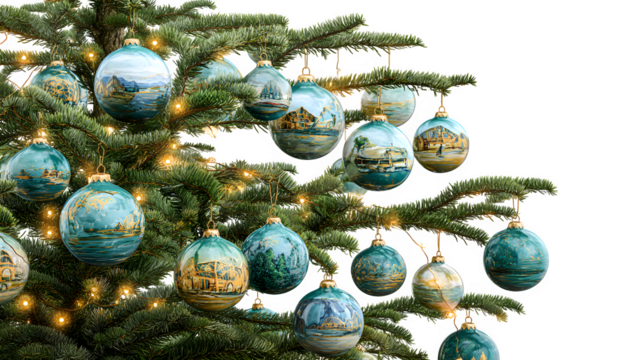 A vibrant, deep green Christmas tree, its branches holding an array of unique, hand-painted ceramic globes depicting winter scenes, illuminated by soft golden lights.