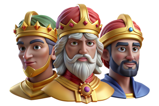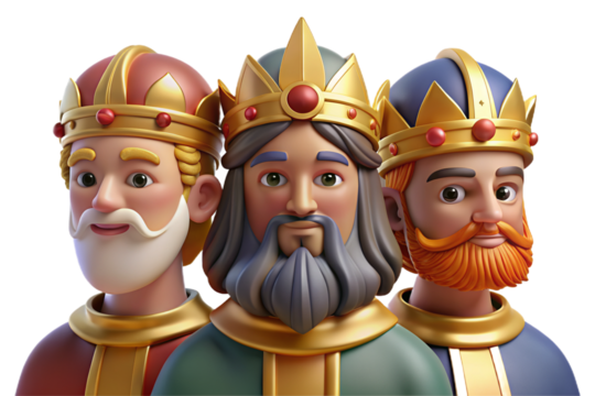 Vibrant 3D cartoon depicting The Three Wise Men on Epiphany, featuring plasticine texture, transparent background for versatile use in print and digital art