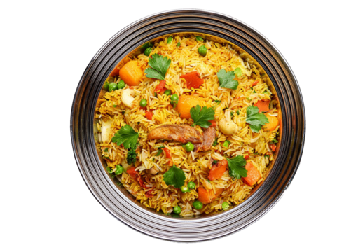 Indian vegetable biryani in balti dish isolated on transparent or white background