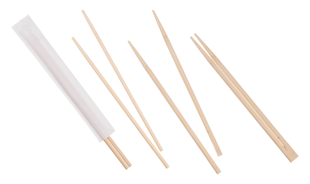 The picture features a set of Asian eating chopsticks. The chopsticks are made of light-colored wood. In the photo, you can see the chopsticks arranged in various positions, some in white paper packag