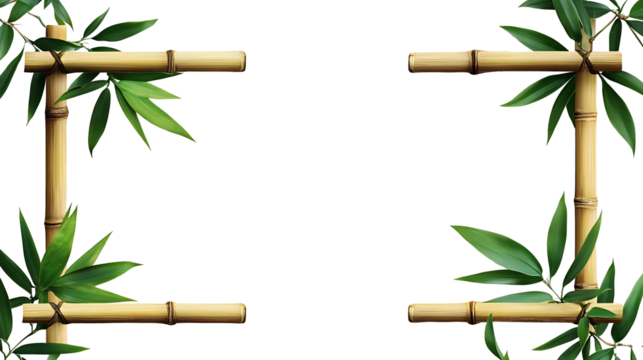 Bamboos frame, A bamboo frame with bamboo leaves , Empty horizontal bamboo frame natural elegance ,   Isolated on white background, clipping path included, transparent png.