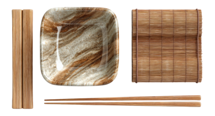 Bamboo mat resting on wooden tray, positioned for sushi serving against transparent background