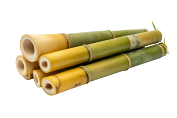 A close-up shot of several bamboo stalks, showcasing their vibrant yellow and green hues against a transparent background. background removed