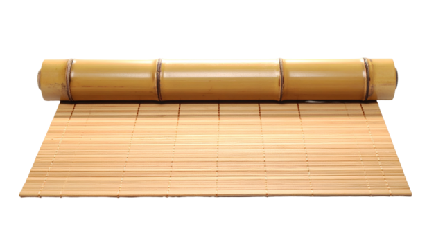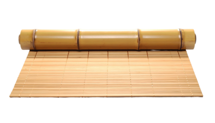 A partially rolled bamboo mat. The unrolled part extends forward. Black background