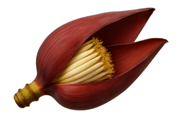 Large banana flower bud with red-purple bracts, yellow stamens emerging, green stem visible, isolated on a transparent background